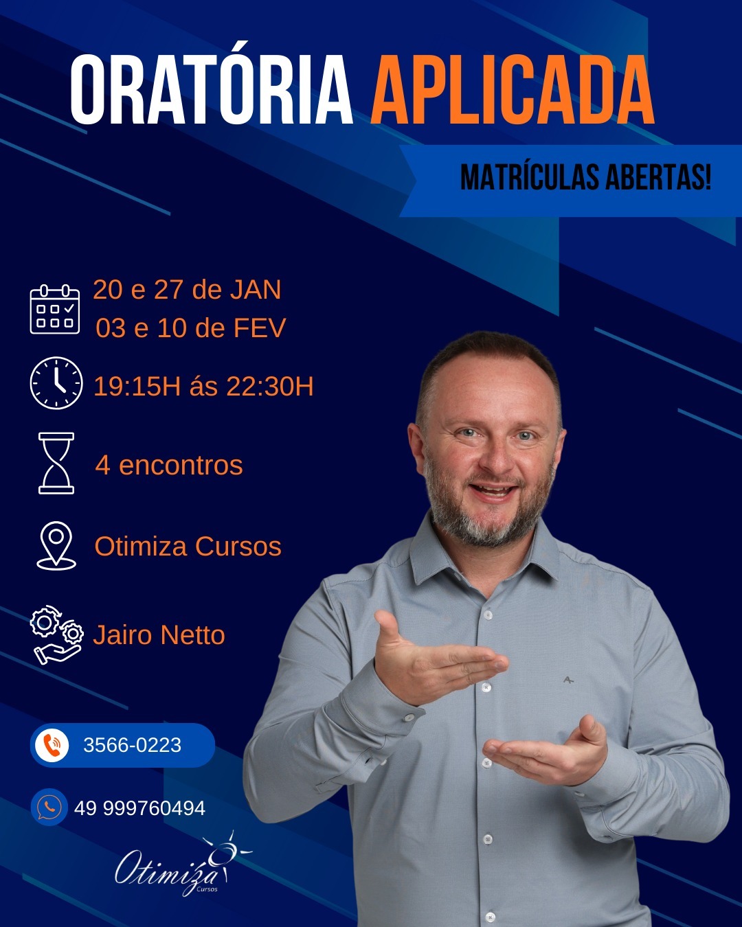 O curso de Oratória Aplicada, tem como objetivo transmitir as técnicas da comunicação e da apresentação em público para eliminar a timidez, o medo de falar em público e a insegurança pessoal, ensinando técnicas para convencer e influenciar